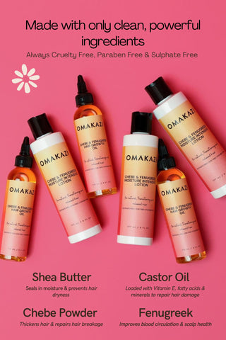 Chebe & Fenugreek Hair Growth Oil is a must-have for those wanting to grow longer, stronger, healthier hair. Infused with natural chebe and fenugreek oil, it help support hair growth, adding strength and moisture to help your locks reach new heights. Transform your hair and embrace healthier, more beautiful manes.